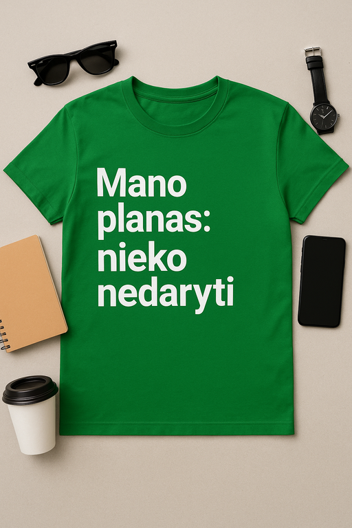 Kartais geriausias planas – jokio plano! Su šiais marškinėliais „Mano planas: nieko nedaryti“ Tu iškart praneši visiems, kad rimtai galvoji apie relaksą. Minkšti, patogūs ir stilingi – jie puikiai tinka tiek gulėjimui ant sofos, tiek tingiems savaitgaliams ar net per Zoom skambučius (jei viršus svarbiau už apačią!). Šis dizainas yra tobula dovana tiems, kurie moka mėgautis gyvenimu be streso ir planų.