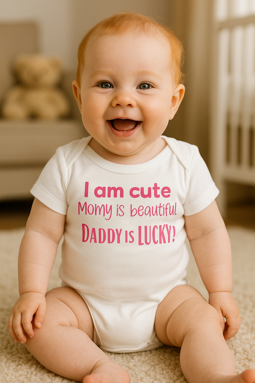 Kai apranga kalba garsiau nei močiutės FB statusas! 😄 Smėlinukas su užrašu „I am cute Momy is beautiful DADDY is LUCKY!“ pasako viską už jus. Tobulas naujagimiams ir tėvams su geru humoro jausmu. 👶❤️