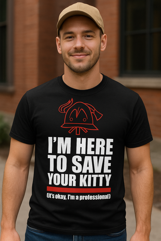 Kai katė įstringa medyje, į pagalbą atskuba stilius. 😎 Juodi marškinėliai su užrašu I’M HERE TO SAVE YOUR KITTY (it’s okay, I’m a professional!) prajuokins bet kurią kompaniją. Tinka ugniagesiams, kačių fanams ir visiems, kurie dieną gelbsti su šypsena. 🚒🐱