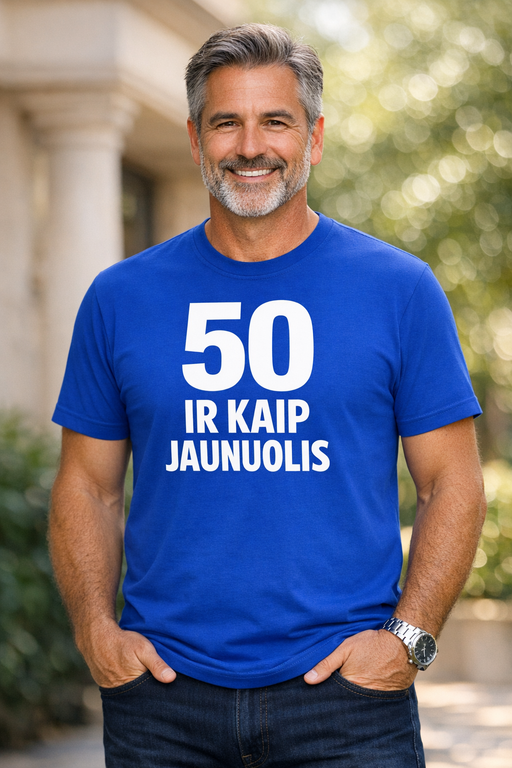50 metų patirties, o energija – kaip jaunystėje! Ryškus užrašas „50 IR KAIP JAUNUOLIS“ iškart sukelia šypseną ir puikiai tinka gimtadienio nuotraukoms, tostams bei geriems bajeriams apie tai, kad metai – tik skaičius.