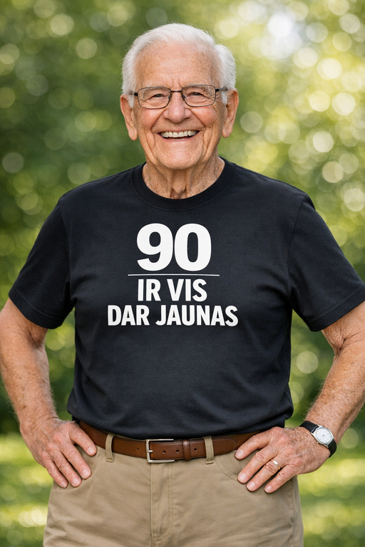 90? Tai tik skaičius – nuotaika vis dar jauna. Juodi marškinėliai su užrašu „90 IR VIS DAR JAUNAS“ iškart parodo, kas čia vakarėlio BOSS.