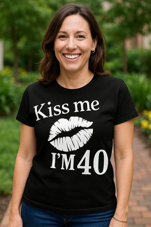 💋 Kai skaičius 40 tampa bučinių magnetu — Kiss me I’M 40 ant krūtinės pasako viską! Šie juodi trumpi marškinėliai su baltu spaudu ir viliojančiomis lūpomis – tarsi VIP bilietas į komplimentus (ir gal dar šį tą).