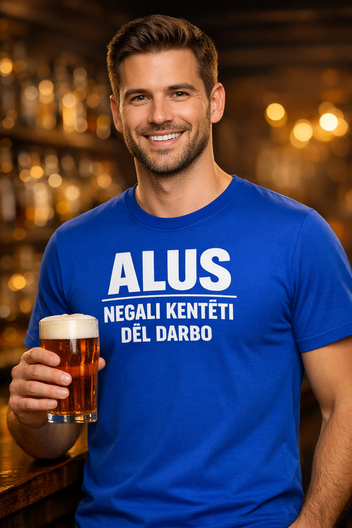 🍺 Darbas palauks, o šaltas alus – ne. Todėl šie marškinėliai aiškiai pasako: „ALUS NEGALI KENTĖTI DĖL DARBO“.
